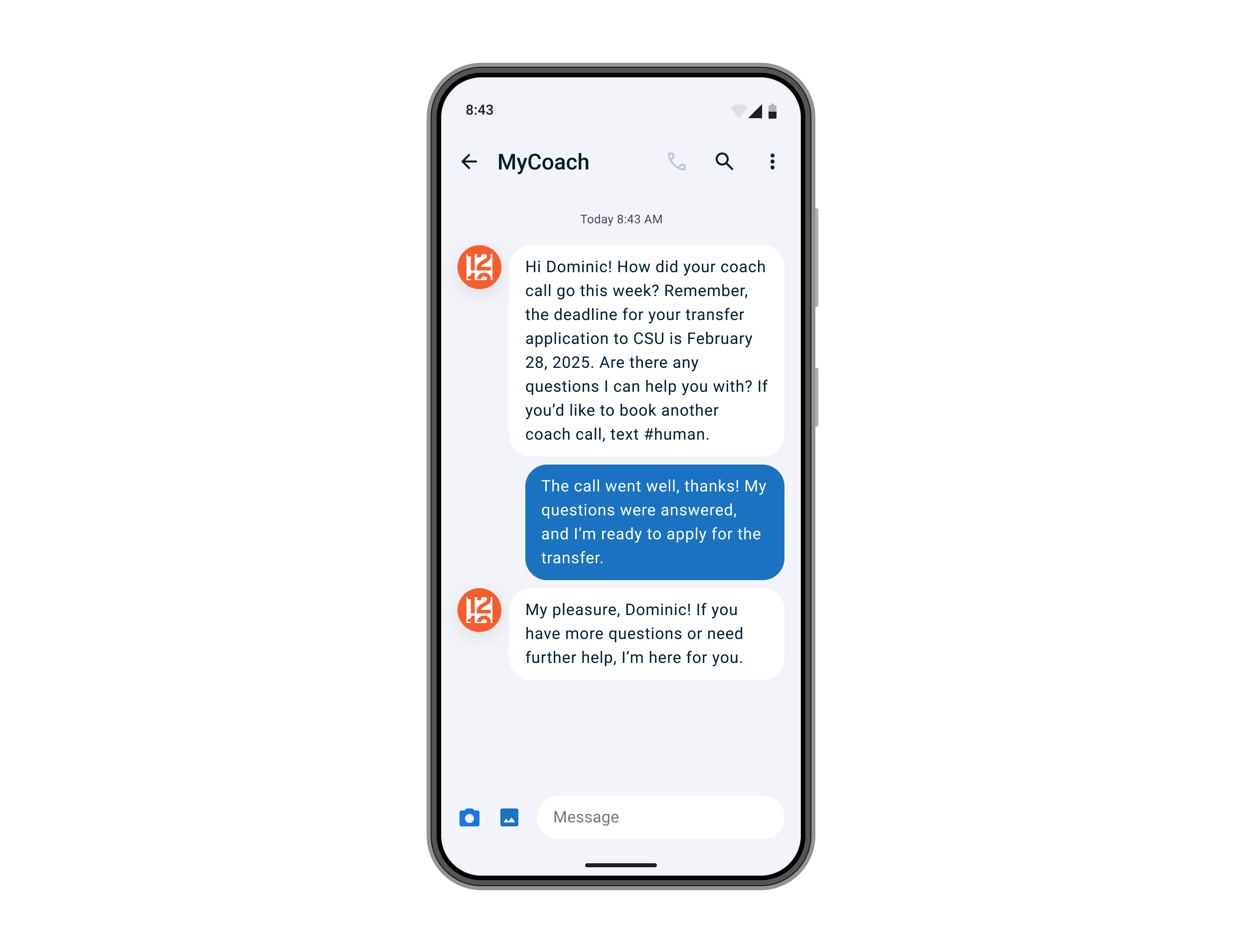 Designed the first generation of MyCoach AI, shaping an approachable, SMS-based coaching experience that lifted student engagement and made support feel immediate and human.