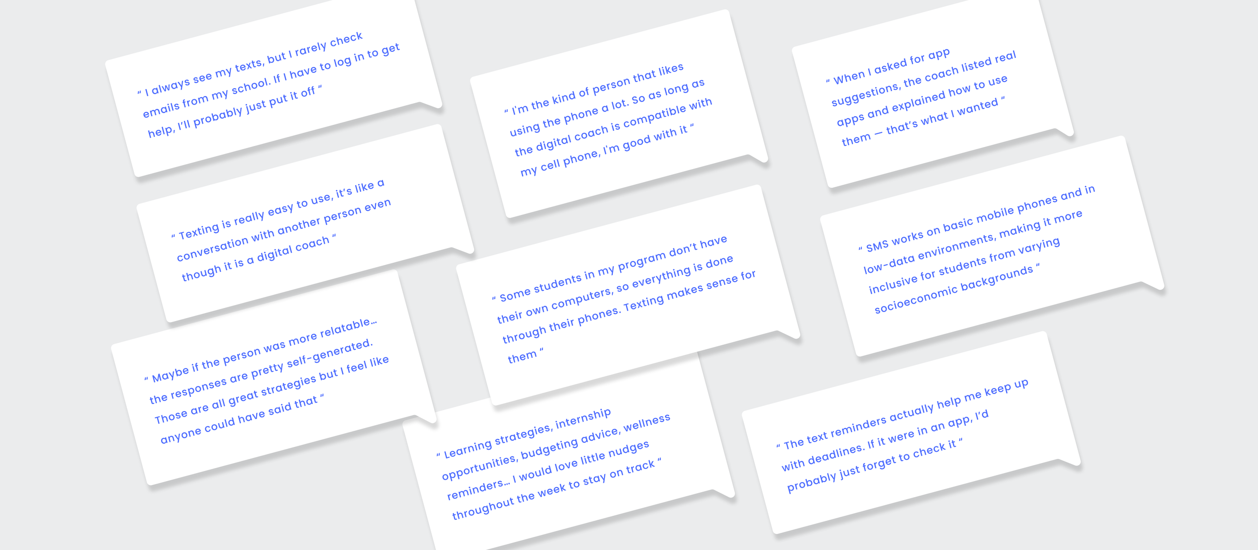 Through co-led research, user testing, and prototype exploration, I uncovered engagement patterns and pain points, surfacing early signals of what students needed. My insights and design prototypes helped the team validate an SMS-first approach that made coaching more accessible and supportive.