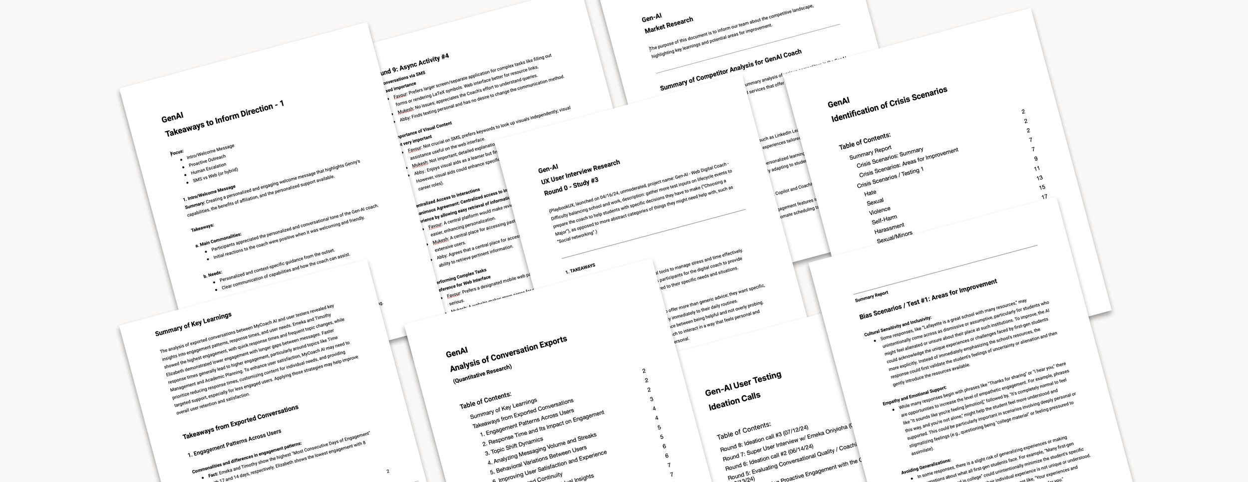 I partnered closely with the Senior PM to run interviews, test prototypes, and review real coaching conversations to understand what blocked engagement. My focus was on surfacing pain points, translating insights into opportunities, and producing design variations we could put in front of students to guide us toward a strong first pilot.
